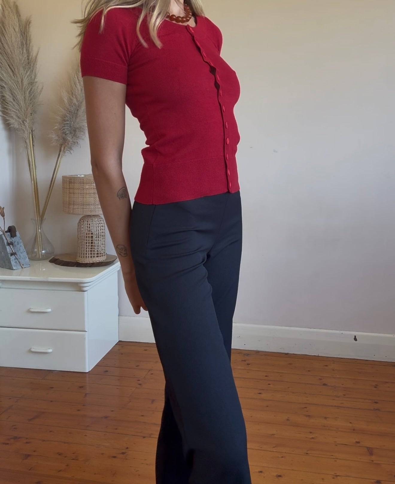 Ruby red, button closure, slight stretch, made from synthetic material. Perfect condition.