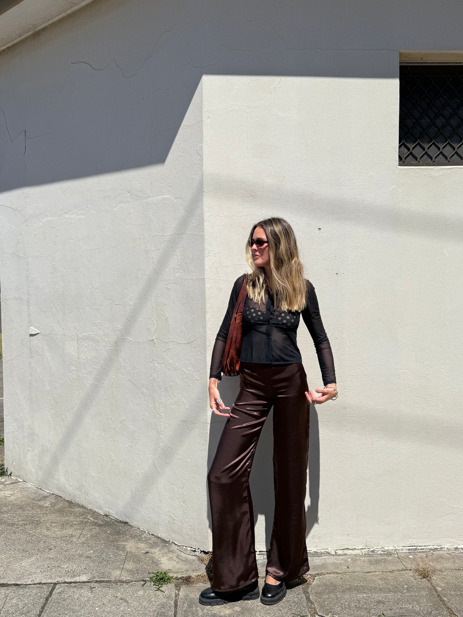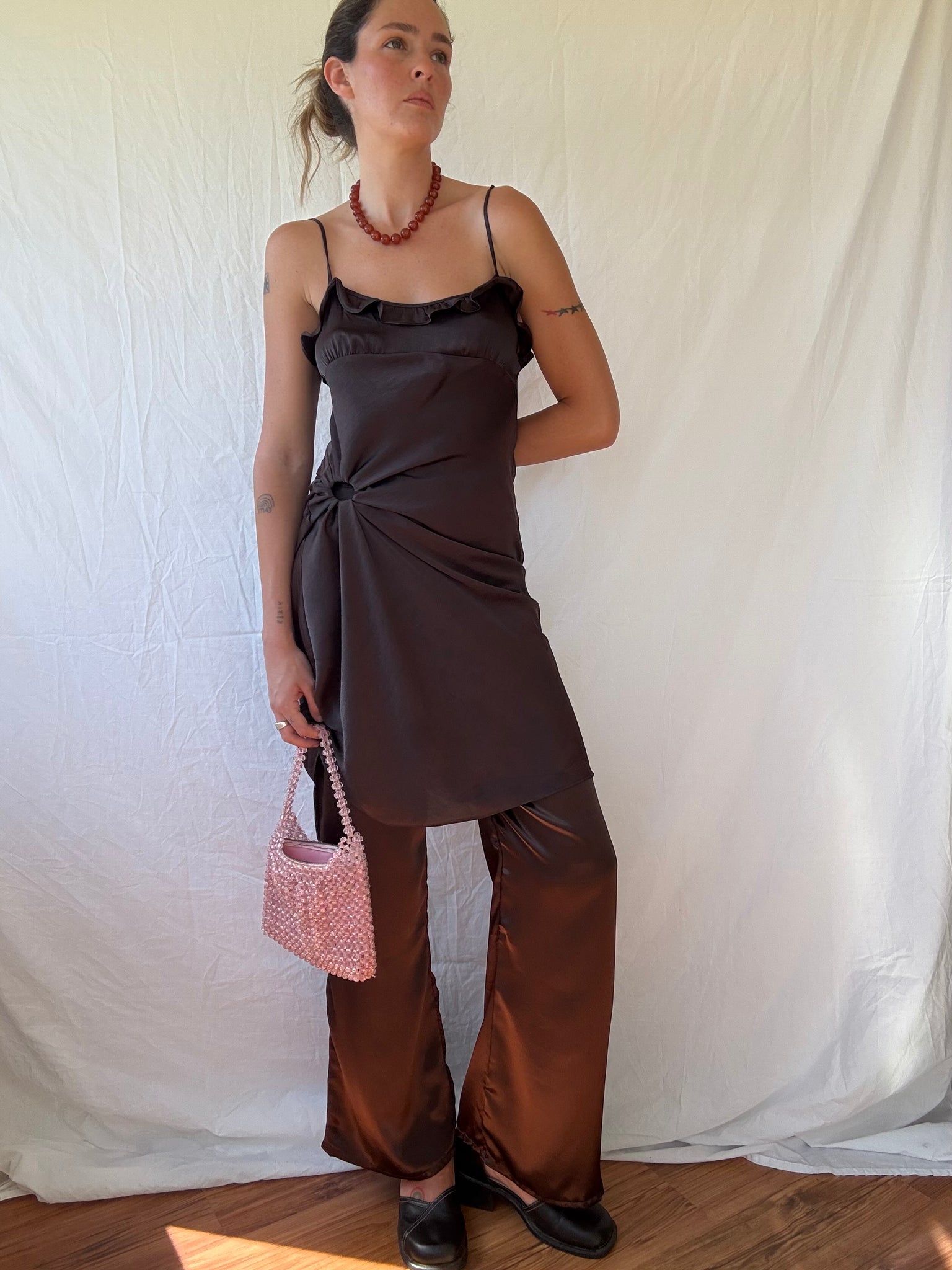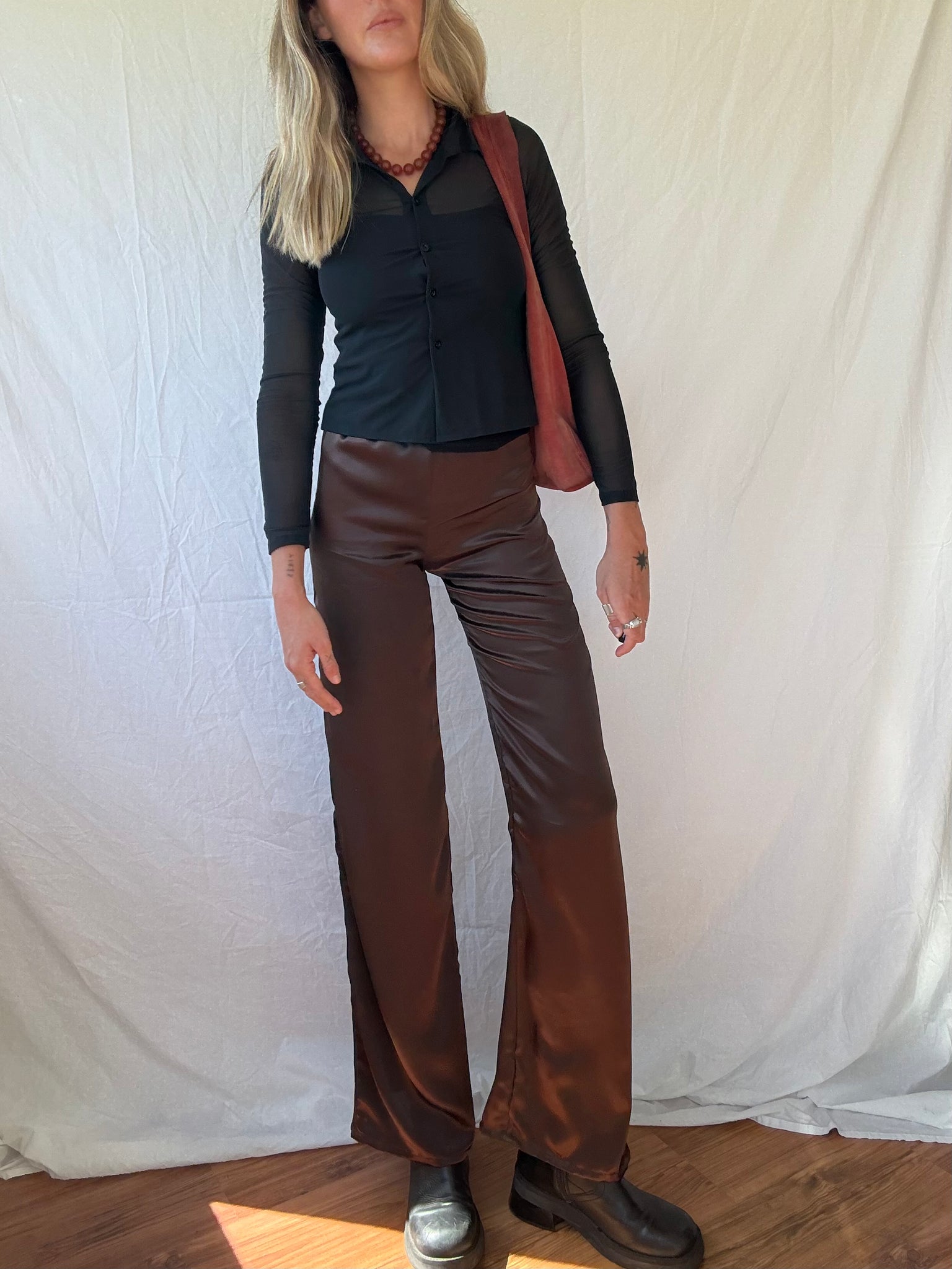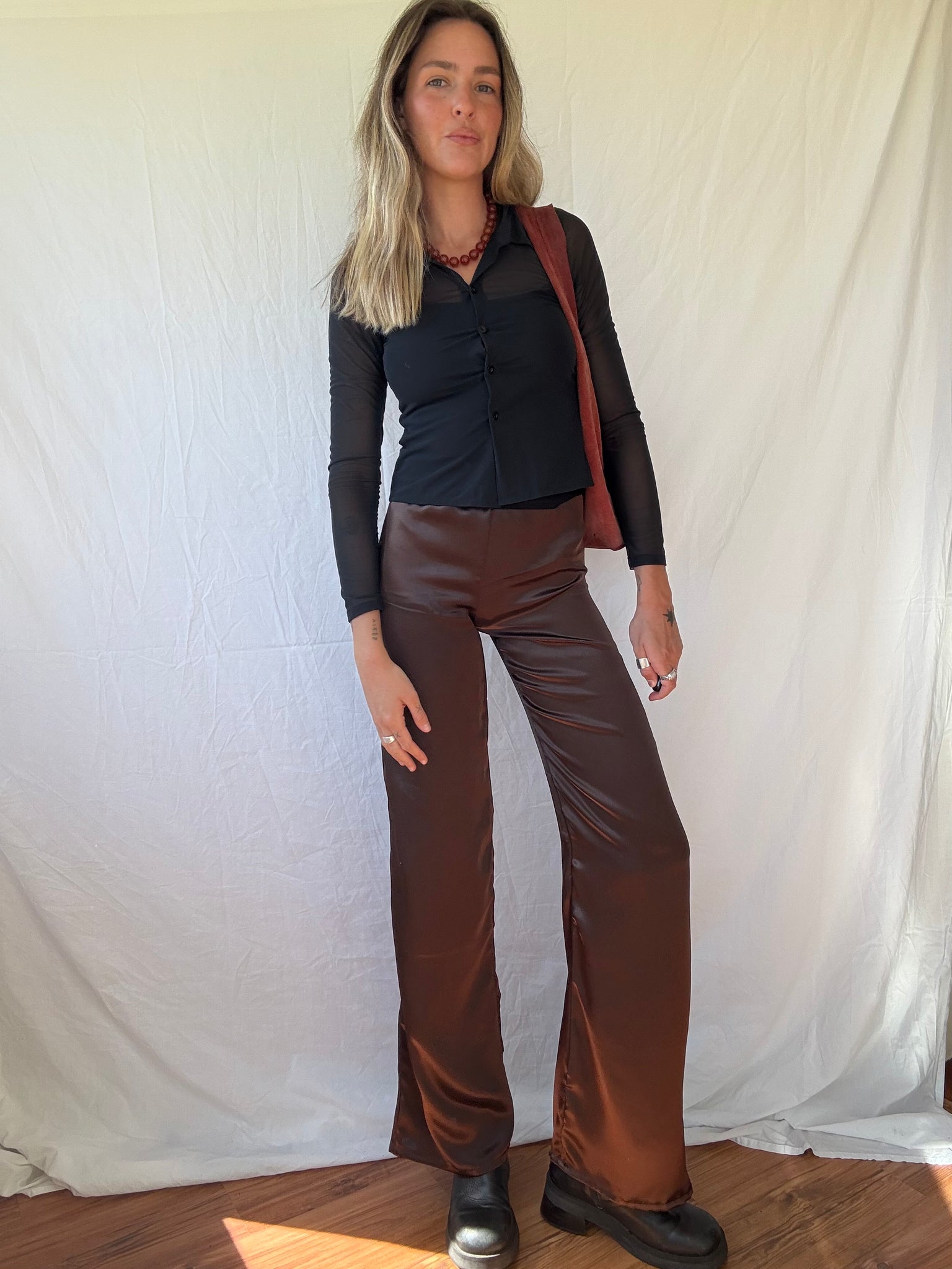 The satin pant in chocolate. Available for PRE-ORDER.